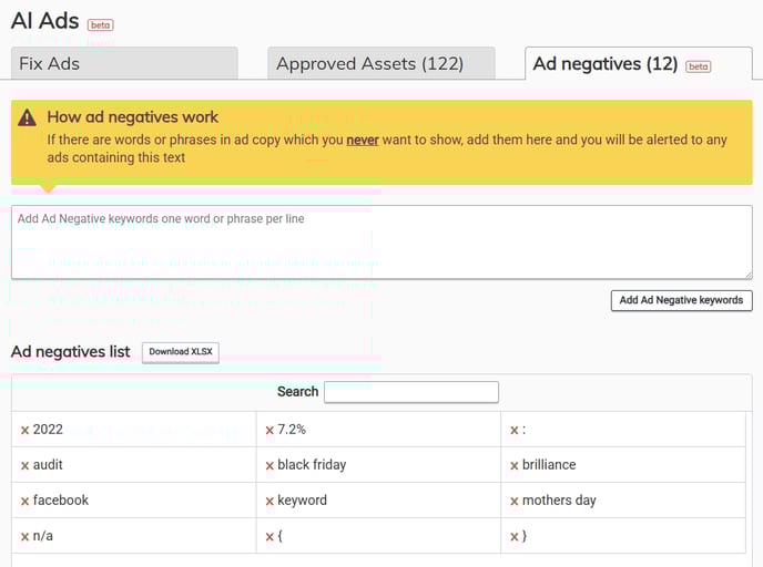 Navigate to 'Optimize', 'AI Ads' and 'Ad negatives' to add your ad negatives. You can also set them up at group or global level and rest-assured that there are no old ads live in any of your accounts - e.g. ensuring no accounts have "black friday" out of the sale period.