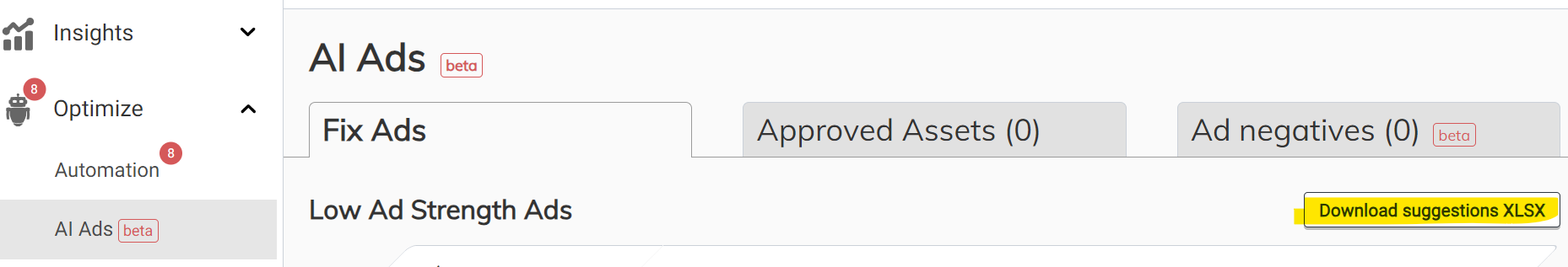 From the AI Ads --> Fix Ads page, you can download the ChatGPT suggestions in bulk.