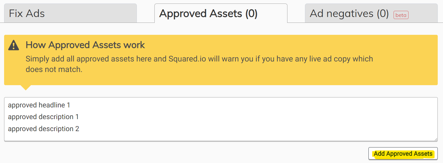 Once you've received approval on the ChatGPT suggestions you sent off, you then add them to the Approved Assets tab.
