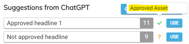 Now, the next time you go to select edit with ChatGPT from the Fix Ads page or RSA low ad strength report, Squared.io will mark which asset suggestions have already been approved - so you can go ahead and optimize your ads.