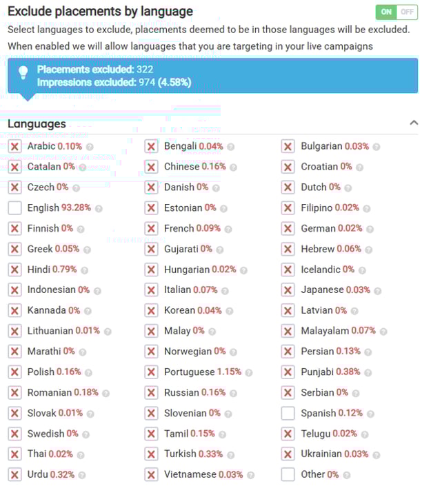When first switched on the automation will exclude any languages it believes you aren't targeting, however you can manually control this using the checkbox system. By removing the cross in the box, you are allowing that as a language for your ad placements.