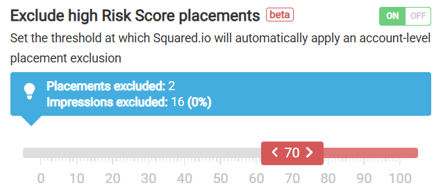 Enable 'exclude high risk score placements' to set a risk score threshold (you can see the number of placements and impressions that would be excluded as a result) to start automatically excluding risky placements.
