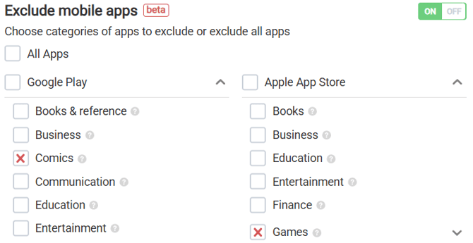 Use the app exclusions if you'd like to exclude all apps or individual categories that could be resulting in wasted spend across relevant campaign types - e.g. excluding 'games for kids' / 'family games' to prevent accidental clicks.