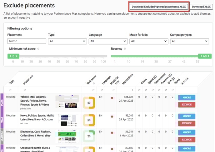 For full instructions on how to set up Manager level ad placement negative lists, see this help article from Google, and to get a list of all current account level placements and how they were added (i.e. manually or automatically in Squared.io or manually in Google Ads), please used the download on the reports placement page: