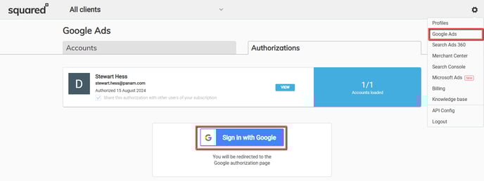 - Add new authorization: Ensure that you have added the new authorization in Squared.io with access to the Google Ads accounts in question. To do this, go to Google Ads in the cog menu, then select Sign In with Google and follow the instructions.