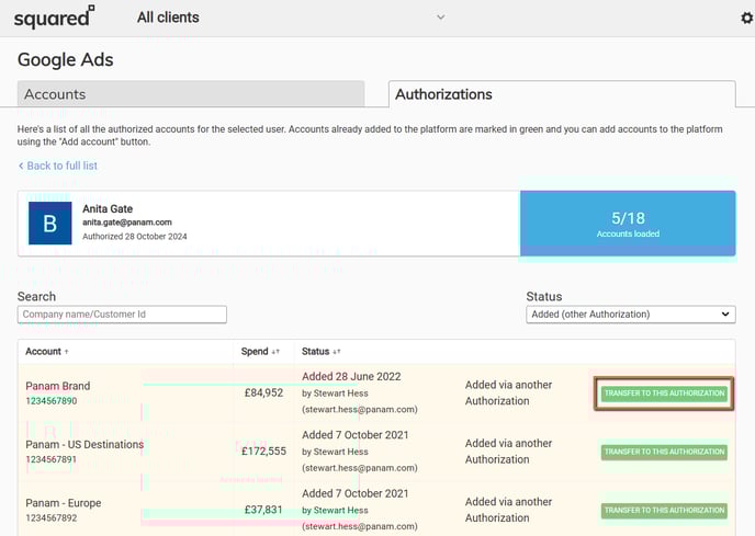 - Transfer to new authorization: On the Authorizations page in Squared.io, select view on the Authorization you would like to transfer the Google Ads accounts to, then find the accounts in the list on page, selecting "Transfer to this authorization":