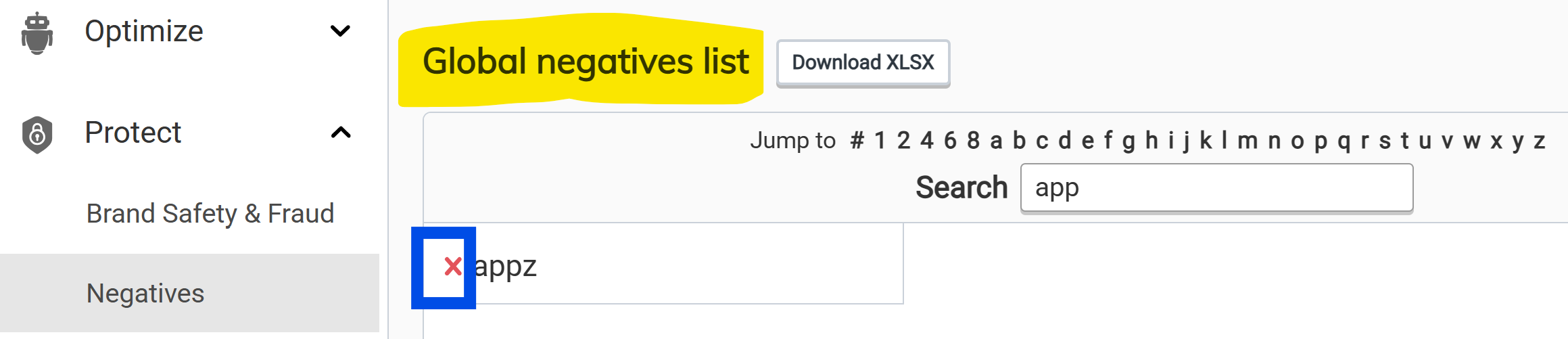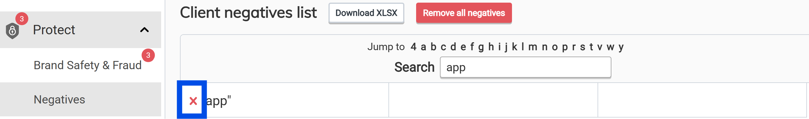 To remove a negative keyword from the Squared: Account Negative Keyword List you'll need to head to 'Protect' and 'Negatives' in the platform. From here you can filter for the negative and click the red 'x' to remove.