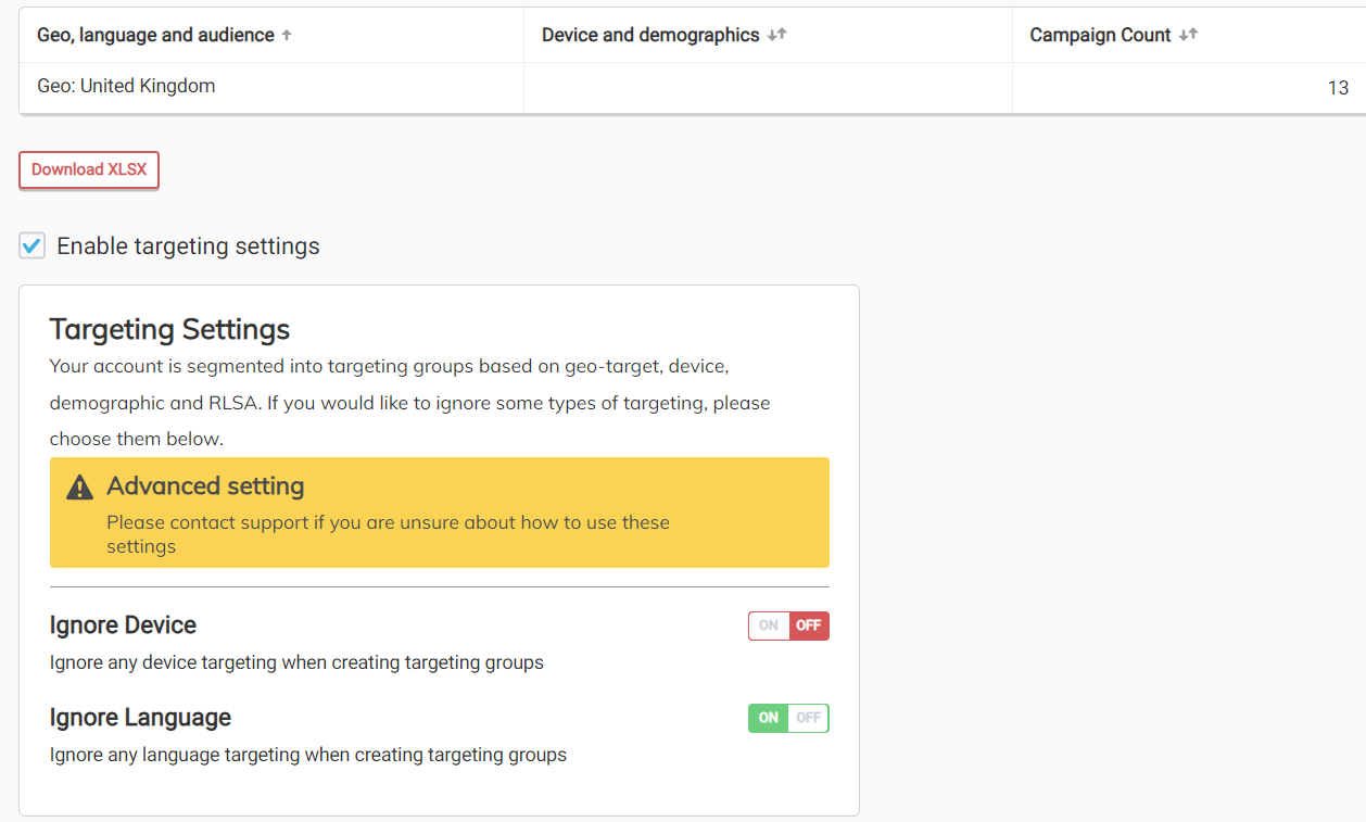 If you have a mixture of language targeting across campaigns but would like Squared.io to treat them as one targeting group, you can select the 'Ignore Language' option - for example if you have campaigns targeting the UK and some using English and others using all languages.