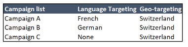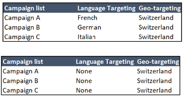 In the case of countries like Switzerland, where multiple languages may be targeted, you will not be penalised if all activity has at least one language applied or none of it has; however you will be penalised if campaigns have a mixture of active language targeting.