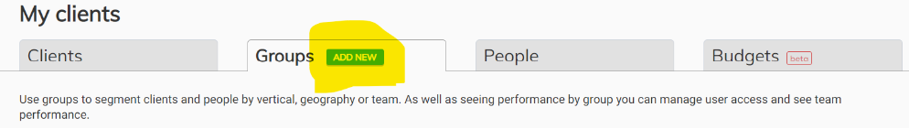 Firstly, to create a group, navigate to this page and hit "add new". You can then give it a name and choose the accounts you want to group. Grouping by team, market, and brand is a great place to start.