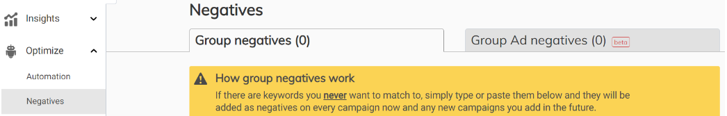 You could use this to see all of the negative keyword conflict issues across all your accounts for example, or to see which keywords and product groups have the highest spend with zero conversions across the board. You can find out more about the insights sections here.