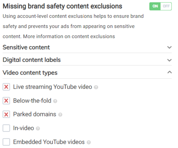 Using account-level content exclusions helps to ensure brand safety and prevents your ads from appearing on sensitive content and the Missing brand safety content exclusions will do this for you.