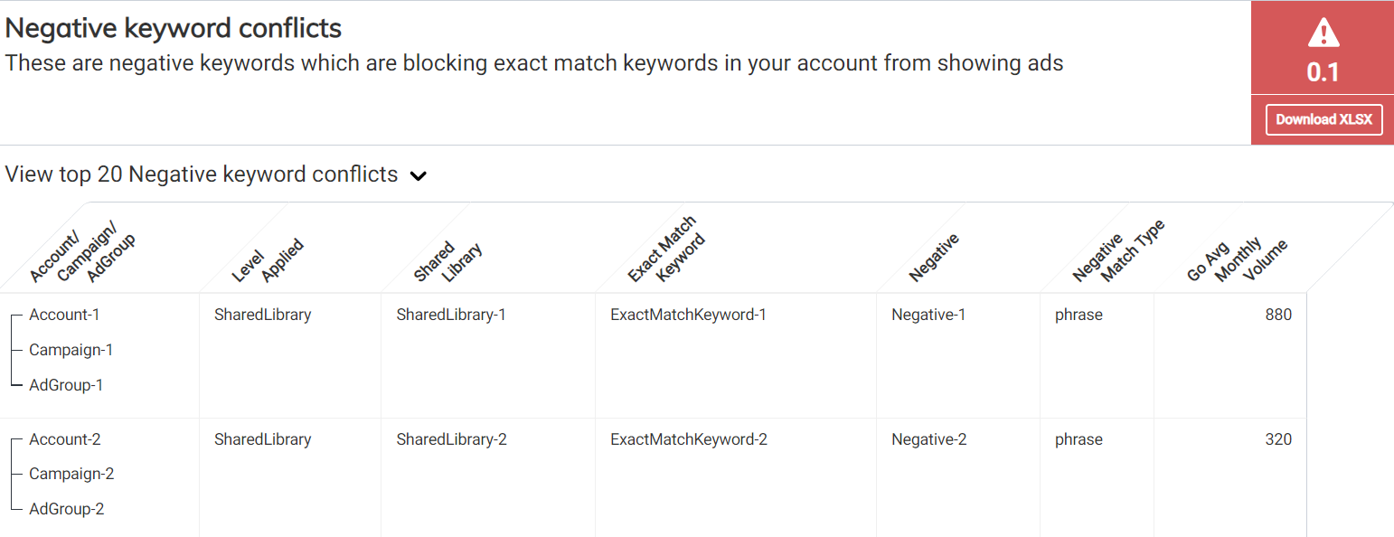 For example, you might have a competitor keyword in a shared library negative list but recently started testing competitor bidding. This report will highlight where it's happening so you can remove the negative keyword from the shared library.