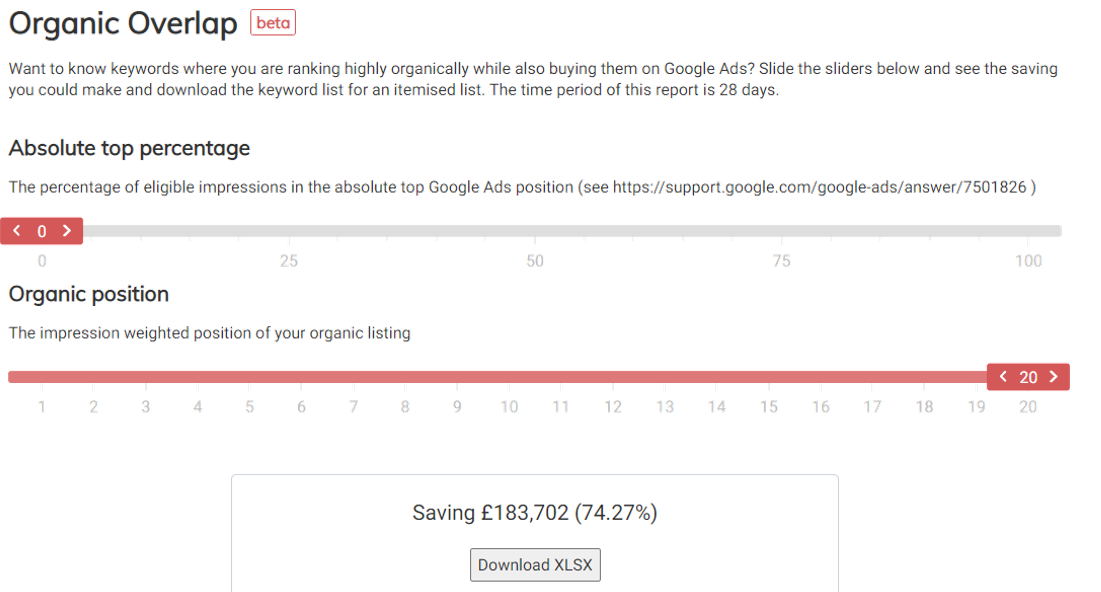The customizable parameters of the report can include all live keywords from Google Ads - helpful for finding keywords which may be high spending but also appearing in the top positions organically.