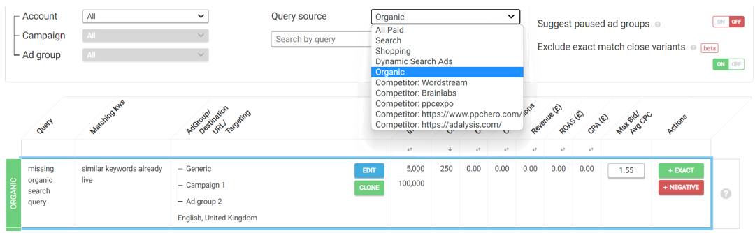 You’ll be able to do a gap analysis between SEO and PPC by heading to “Optimize”, “Add queries” and using the query source drop-down to select “Organic”.