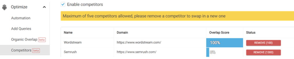 To get started, navigate to "Competitors" under the "Optimize" overlap and hit "enable competitors". This will produce a list of the competitor domains who have the highest overlap with your keywords. "Overlap score" shows you how many of your keywords each domain is appearing for in the organic results. Adding those with a high overlap can be beneficial as they are likely to have most relevant queries to review.