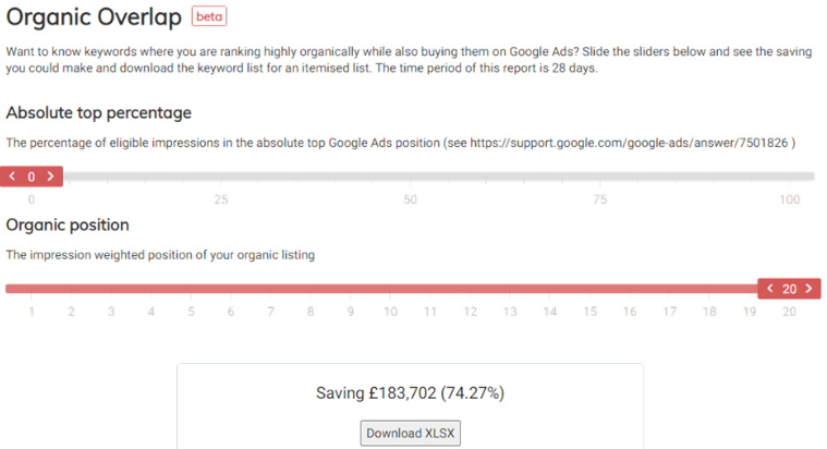 The customizable parameters of the report can include all live keywords from Google Ads - helpful for finding keywords which may be high spending but also appearing in the top positions organically.
