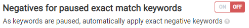 If opted in, Squared.io can apply negatives for paused exact match keywords, with the intention that you would not want to appear on these paused keywords. However, if paused exact match keywords you do not wanted negated across your account are being added you can re-activate or remove the paused keyword - this will result in the negative being removed at the next sync.