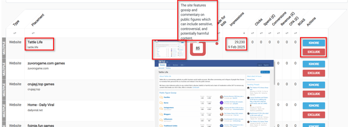 Each placement is assigned a risk score - calculated using ChatGPT - to review placement content to help you to quickly identify low-quality or potentially harmful placements.