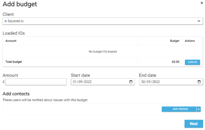 - Step 3: Click add person to choose who you want to receive budget notifications – when your budget is on pace to over or under-spend by 10% – and click next to continue.