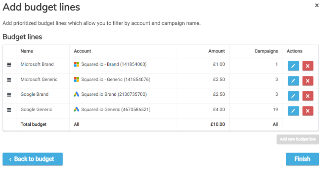 - Step 5 (budget lines): Choose an account for your first budget line. Give your budget line a name and input the budget amount. You can then choose to include all campaigns within that account, filter for specific campaigns using the naming convention or filter for specific labels applied to your campaigns. Repeat for remaining budget lines and hit finish to complete set up.