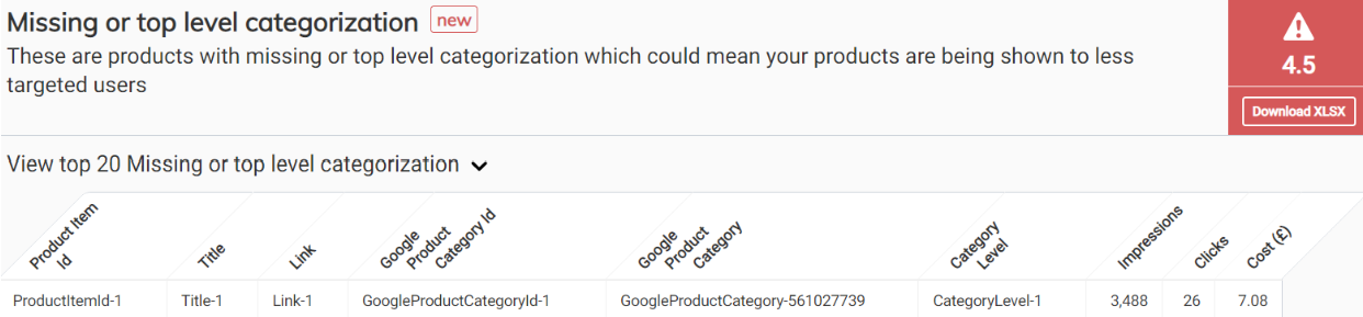 Missing or top level categorization: The product category column is one of the key values used by Google to determine which queries to show your products for – so this should be as granular as possible to match to the most relevant queries and expand reach. You can find the available product categories and IDs here (GB).