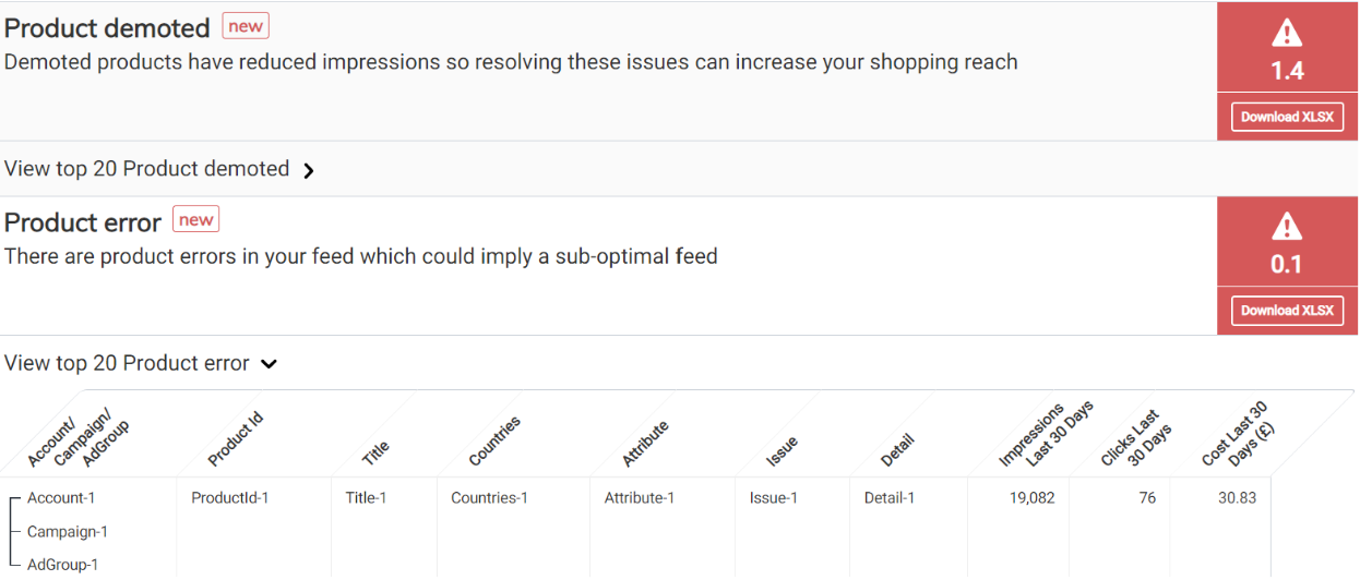 - Product demotions & errors: Resolve products missing out on impressions due to missing or incorrect columns in GMC