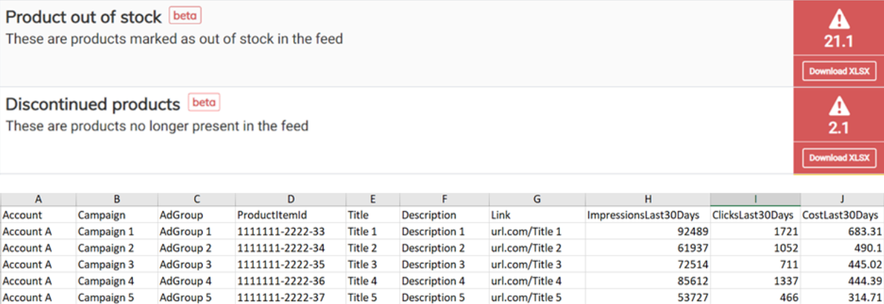 In Conversion score you can find two reports - discontinued products and product out of stock- which will help you validate performance fluctuations. They show you recent performance data to help you see how your campaigns are being impacted by changing stock levels or products being removed from the feed.