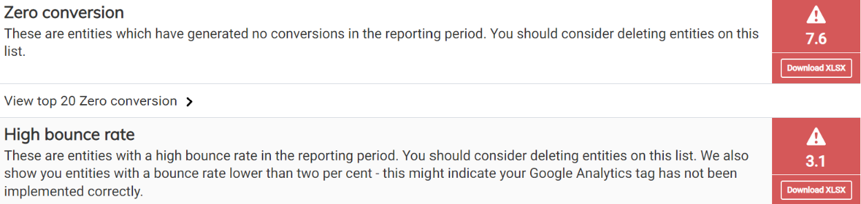 Zero conversion / high CTR: Check if you're product groupings are delivering on conversions and not driving a high bounce rate. These reports show you the highest spending entities (keywords and product groups) which have not recently delivered a conversion - these areas should be optimized or paused/excluded.