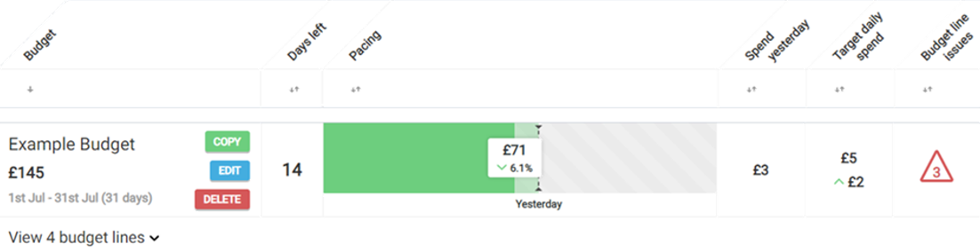 It's a good idea to regularly check your budget pacing to ensure you're on track to spend your budget by the end of the period. You'll get email alerts when your budget is over/under pacing by more than 10%, which is a good time to check spend levels and make the relevant changes.