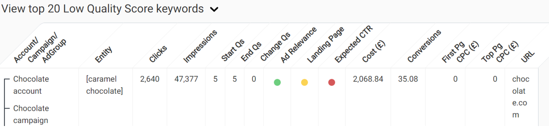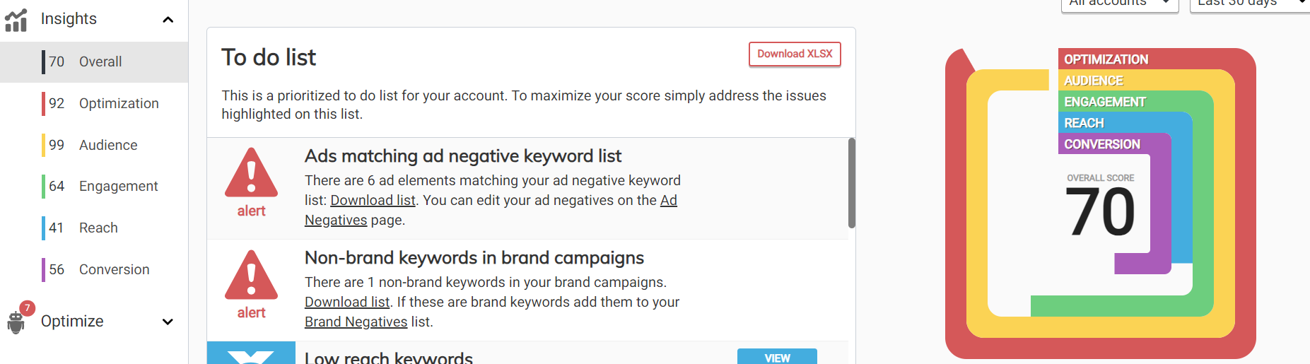 Quality Score improvement (Engagement score): The most conclusive way to save money in Google Ads is by improving quality score. Value score highlights how quality score is trending across the account, and has reports for decreasing, increasing, low and very low score keywords. These reports show you each area of quality score and their historic level to help pinpoint potential improvements and monitor the impact of any copy or landing page changes made.