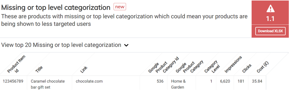 Missing product categories (Audience score): The product category column is one of the key values used by Google to determine which queries to show your products for – so this should be as granular as possible to match to the most relevant queries and expand reach. You can find the available product categories and IDs here.