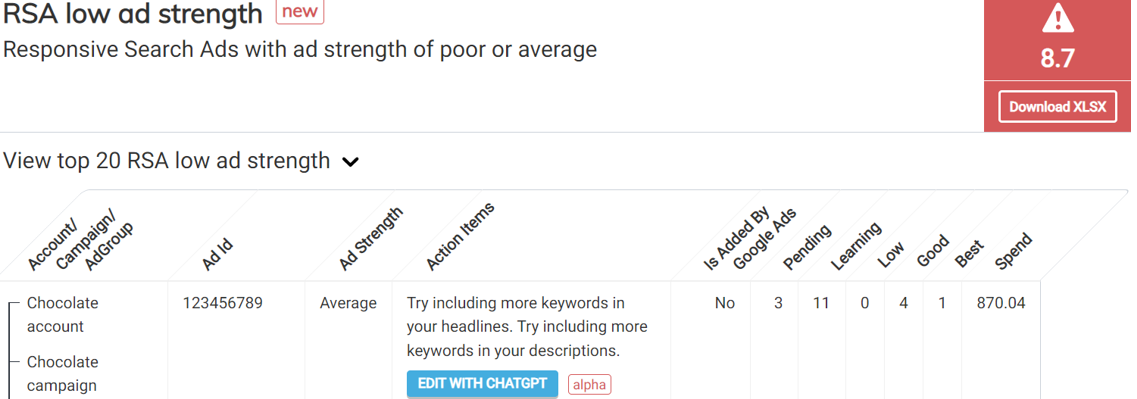 We show you Google's recommendations for improving your ads, with a headline and description breakdown on the download - helping you decide which to keep and which to test. You can also improve you ad copy using our ChatGPT integration, which you can see here.