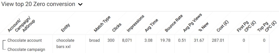 You can download this report to see the highest spenders which have not recently converted and decide which action to take - whether that's pausing keywords, excluding products or tweaks to landing pages, bids or copy.