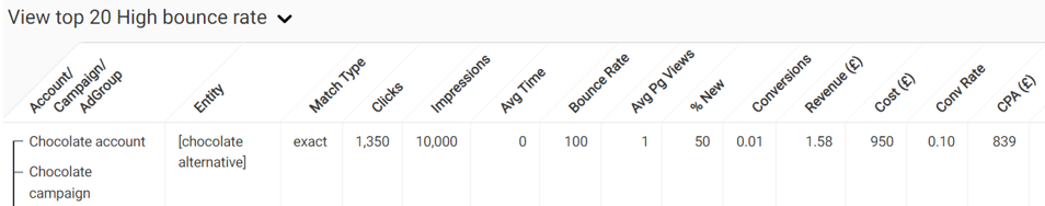Reducing high bounce rate spend (Conversion score): Keywords with a high bounce rate suggest a lack of congruence in the customer journey. This may indicate that either the landing page the user is being directed to is not relevant enough or that the keyword is not of high value to the business.