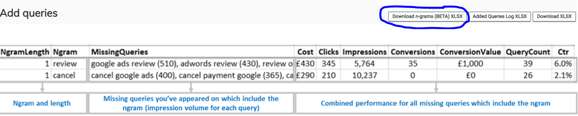 n-grams analysis (Add queries under Optimize): This report analyses all of your missing queries and shows you the aggregated performance for every n-gram (an n-gram is a phrase made up of a number (n) of words) in terms of CTR, spend and impressions. This allows you to quickly identify phrases that you could add to your ad groups, but at the same time, could highlight a negative phrase to add to your account-level shared library.