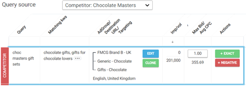 Competitor queries (Add queries and Competitors under Optimize): Get actionable keyword research by using the competitor feature to find new queries that are currently being missed in your paid search activity (and organic rankings if you've linked Search Console).