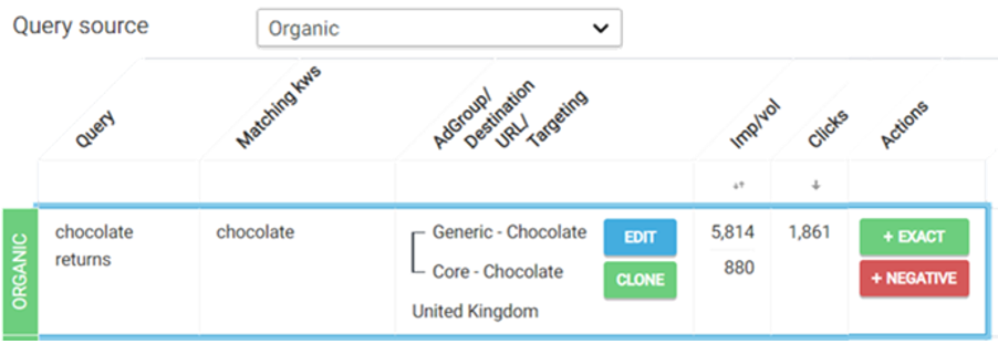 Organic queries (Add queries under Optimize): If you're looking to maximise your search coverage, perform a gap analysis between SEO and PPC by surfacing the queries you’re ranking for organically but missing out on in paid search. This view includes the organic delivery for impressions and clicks as well as the average monthly search volume according to Google.