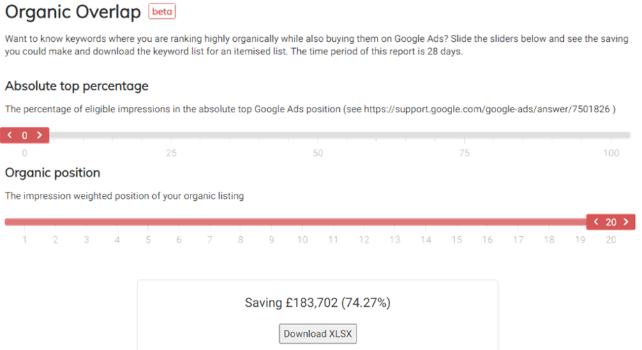 Monitoring organic overlap (Organic Overlap under Optimize): You can use this report to see if there are potential cost savings to be delivered on the keywords you're buying when they are also ranking organically and have low paid search competition.