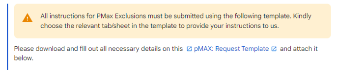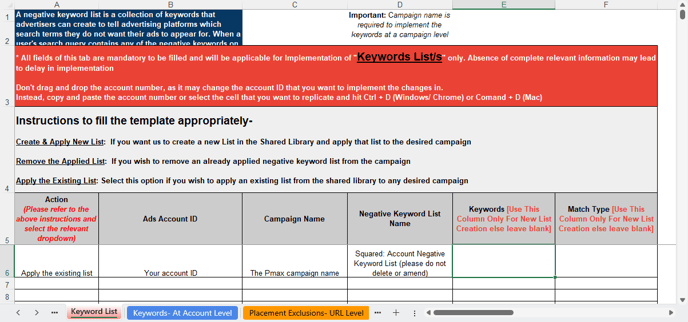 Once you have downloaded the Request Template, go to the Keyword List tab and put these details in the following columns for each Pmax campaign you have: