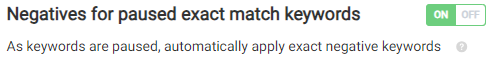 Pausing an exact match keyword does not always mean you won't appear against the query. You can ensure paused really does mean paused by switching on ‘Negatives for paused exact match keywords’.