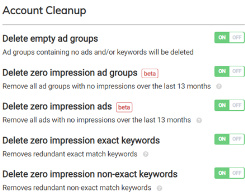 Like you, we love keywords... However, more isn’t always better! Redundant keywords can make accounts cumbersome and difficult to manage. Turning on the account cleanup automation ensures keywords which have not recently delivered an impression and are not expected to deliver impressions are removed.