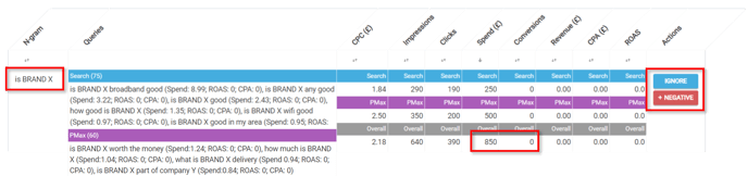 In the example below, the n-gram is 'is BRANDX'. This phrase has appeared in 75 Search and 60 PMax queries, spending £850 without delivering a conversion. Hit 'negative' and eliminate this inefficient traffic going forward!