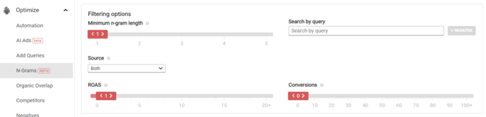 Use the filters to surface n-grams driving a negative ROAS or not converting to start reducing your unseen wasted spend.