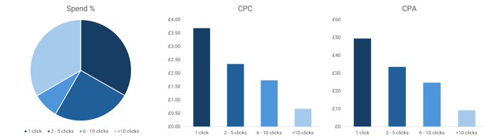Analysing over a million missing search queries across the Squared.io platform, spend by click volume over a 30 day period shows a third of spend was on queries clicked just once. Performance data also shows CPC increases with each volume breakdown, with CPA following the same trend.