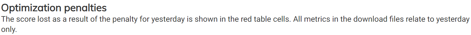 Squared.io scores and penalties throughout the Insights sections are based on the previous day's data. Information on the report download data date range can be found at the top of the list - For instance, on the Optimization score page: