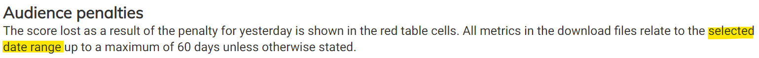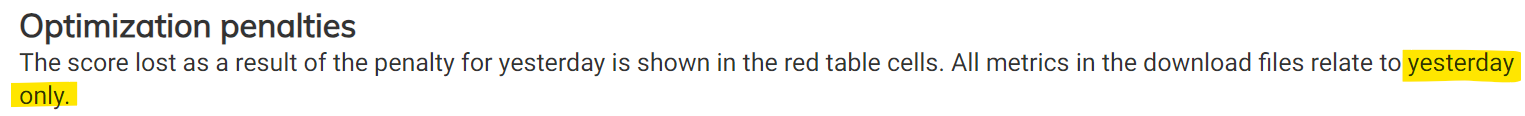 Squared.io scores and penalties throughout the Insights sections are based on the previous day's data. Information on the report download data date range can be found at the top of the list - Optimization example below.